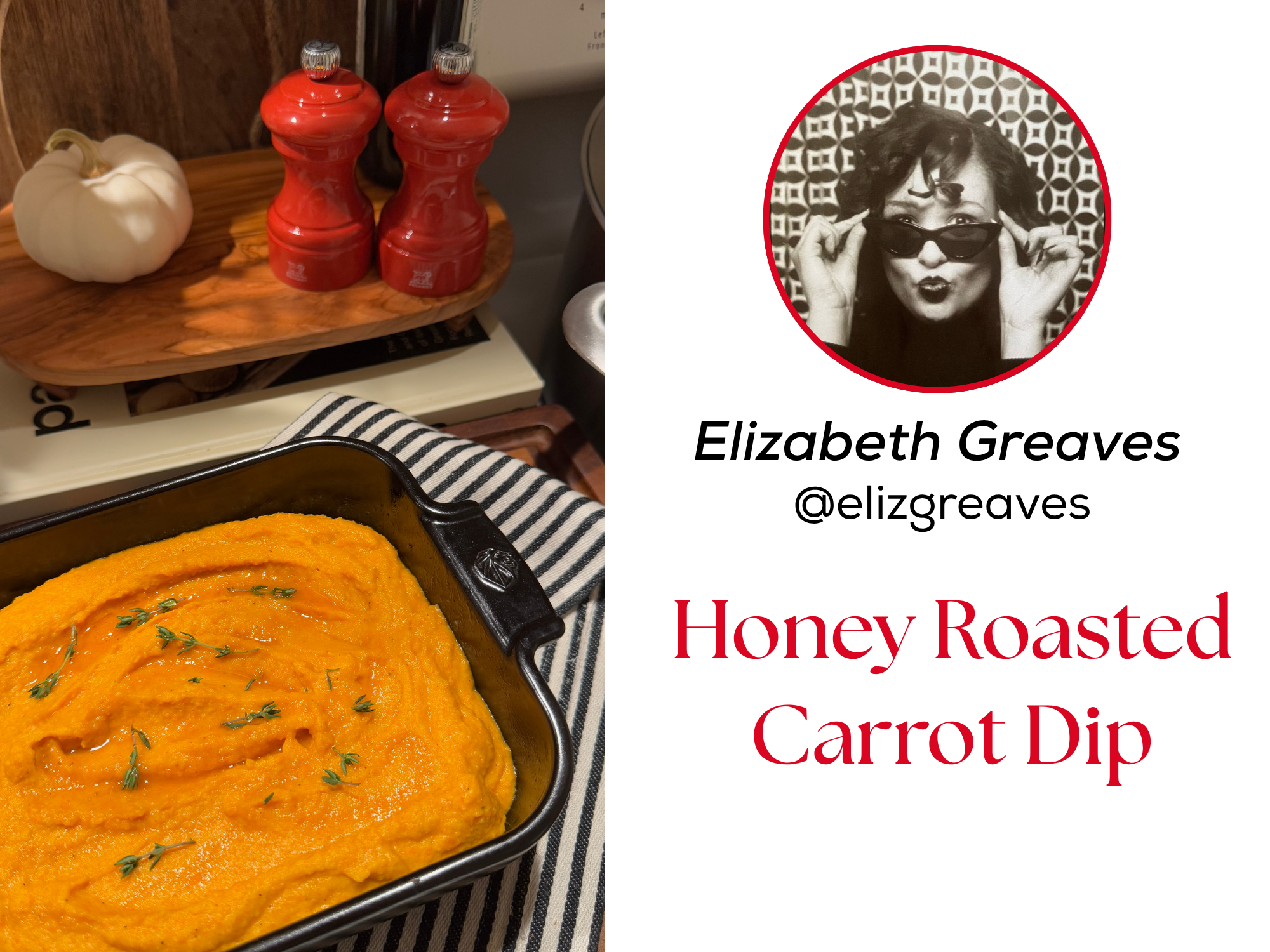 Elizabeth brings a bright and thoughtful start to the season with her Honey Roasted Carrot Dip. She roasts the carrots until they soften and caramelize, then blends them with chickpeas, warm spices, and a touch of honey for a dip that feels both comforting and refined. The result is creamy, gently sweet, and full of warmth, the kind of appetizer that invites people to settle in and snack while the rest of the meal comes together. It is simple, flavorful, and perfect for sharing.