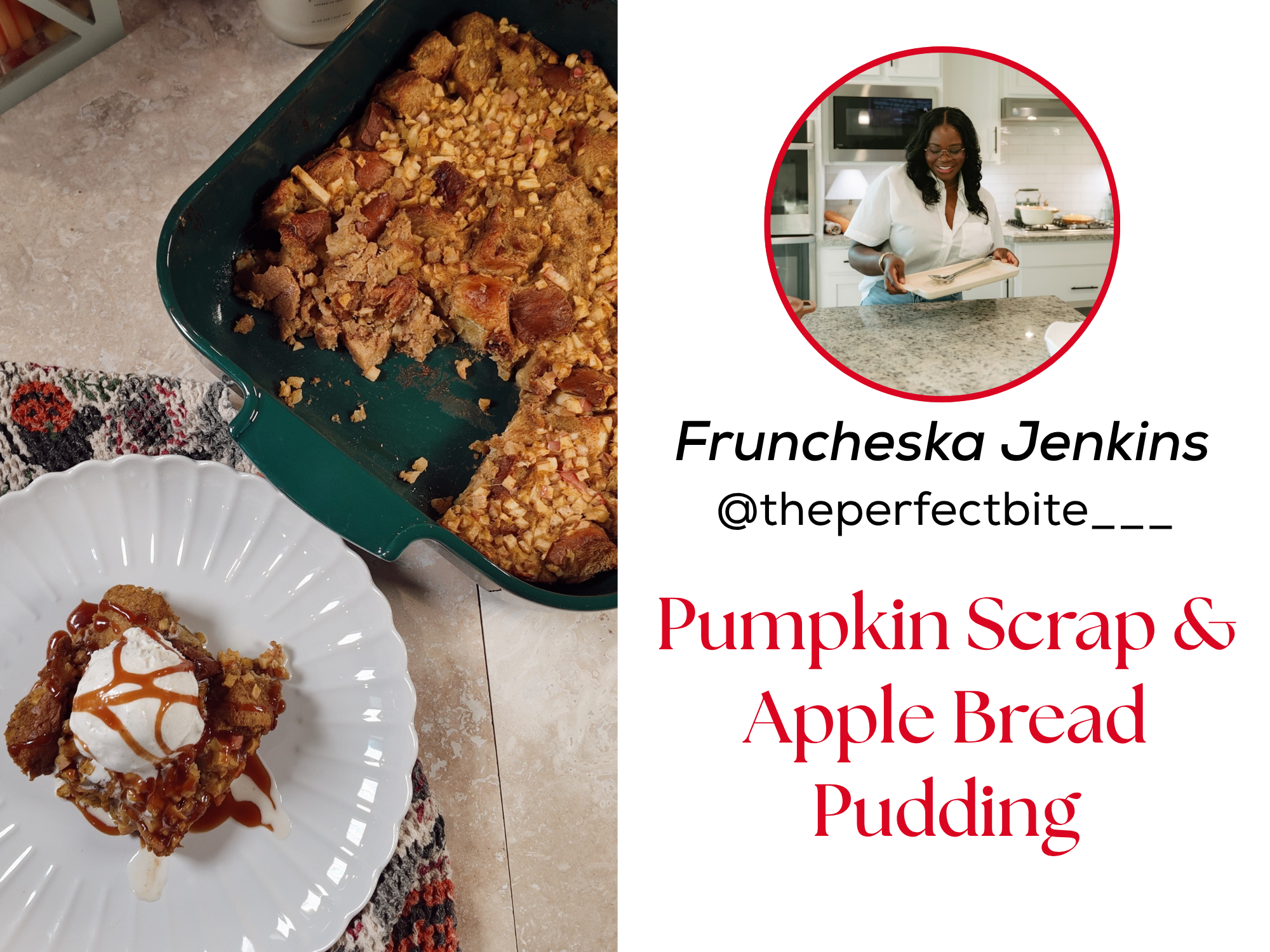 Fruncheska brings a gentle sense of comfort to the season with her Pumpkin Scrap and Apple Bread Pudding. She takes the leftover bits we usually overlook and turns them into something tender, sweet, and satisfying. The apples soften into the custard, the pumpkin adds depth, and the whole dish settles into that perfect balance of cozy and elegant. It is the kind of dessert that invites people to wash a little longer after the meal.
