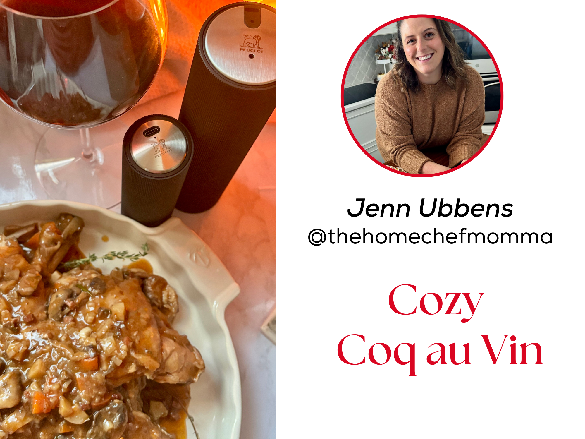 Jenn brings a rich, comforting touch to the season with her Cozy Coq au Vin, a classic French chicken stew braised slowly with red wine, pancetta, mushrooms, and herbs. The flavors deepen as it simmers, creating a dish that feels warm, inviting, and perfect for holiday cooking or any cool weather gathering. It is elegant comfort food at its best and an easy way to bring a little French-inspired warmth to the table.