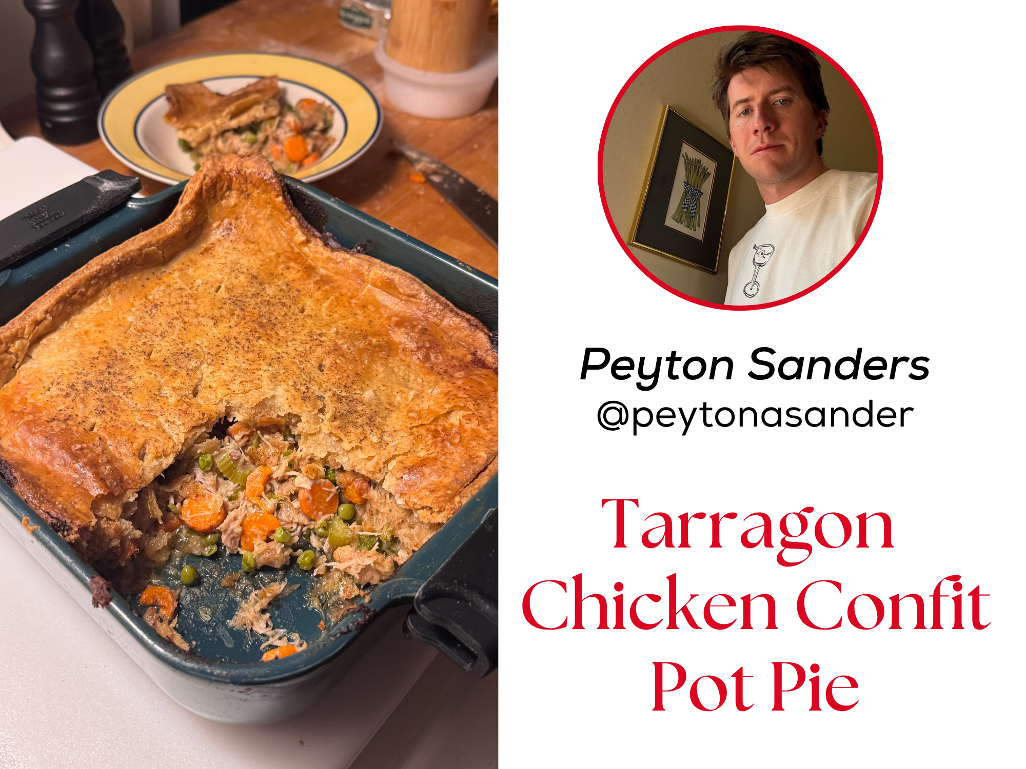 Peyton brings depth and heart to the season with his Tarragon Chicken Confit Pot Pie, baked in our Appolia Square Oven Dish. The chicken is slowly cooked until it turns tender and rich, the tarragon adds a fresh lift, and the vegetables settle into a creamy filling that feels both comforting and elevated. The flaky pastry on top makes it feel special without adding extra fuss. It is the kind of dish that anchors a gathering and fills the room with warmth, perfect for holiday hosting or any night you want something truly satisfying. A beautiful way to bring a little homemade care to the table.